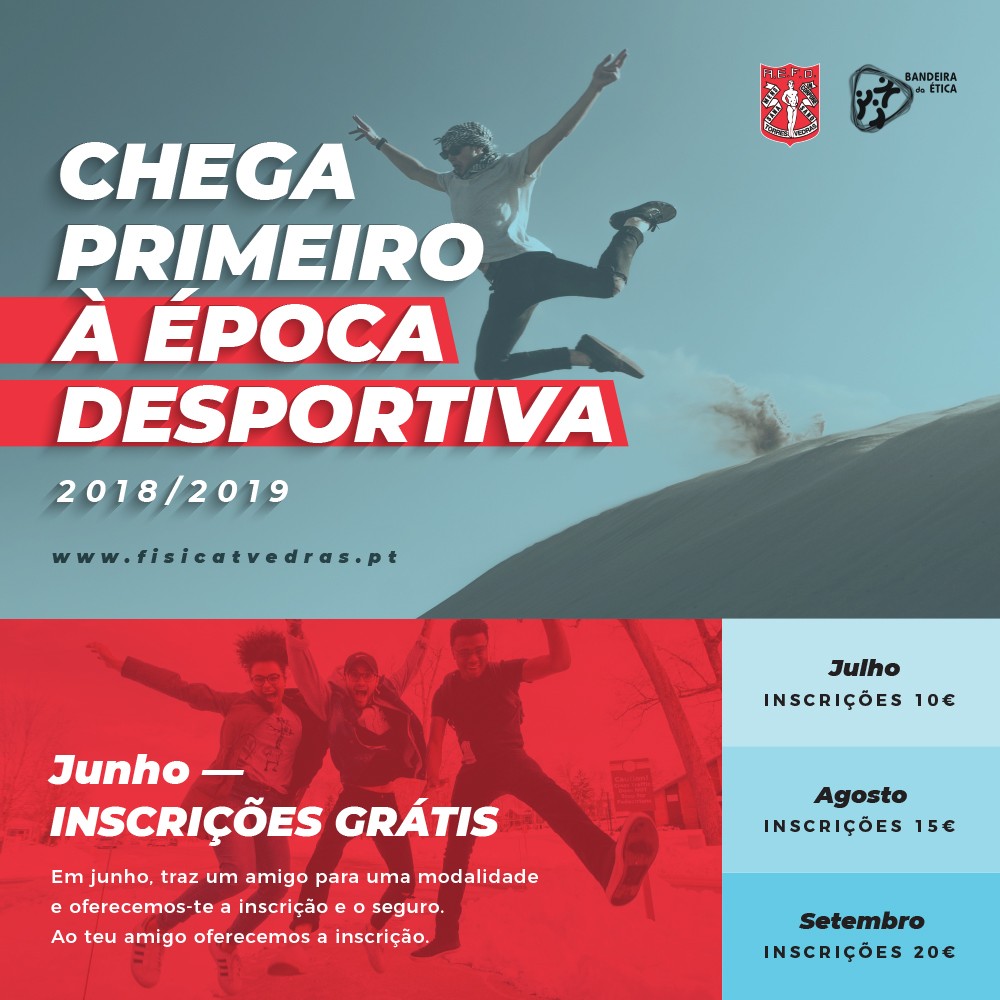 Em junho, oferecemos a inscrição e, para quem trouxer um amigo que se inscreva numa modalidade, oferecemos o seguro. Ao amigo, oferecemos também a inscrição.