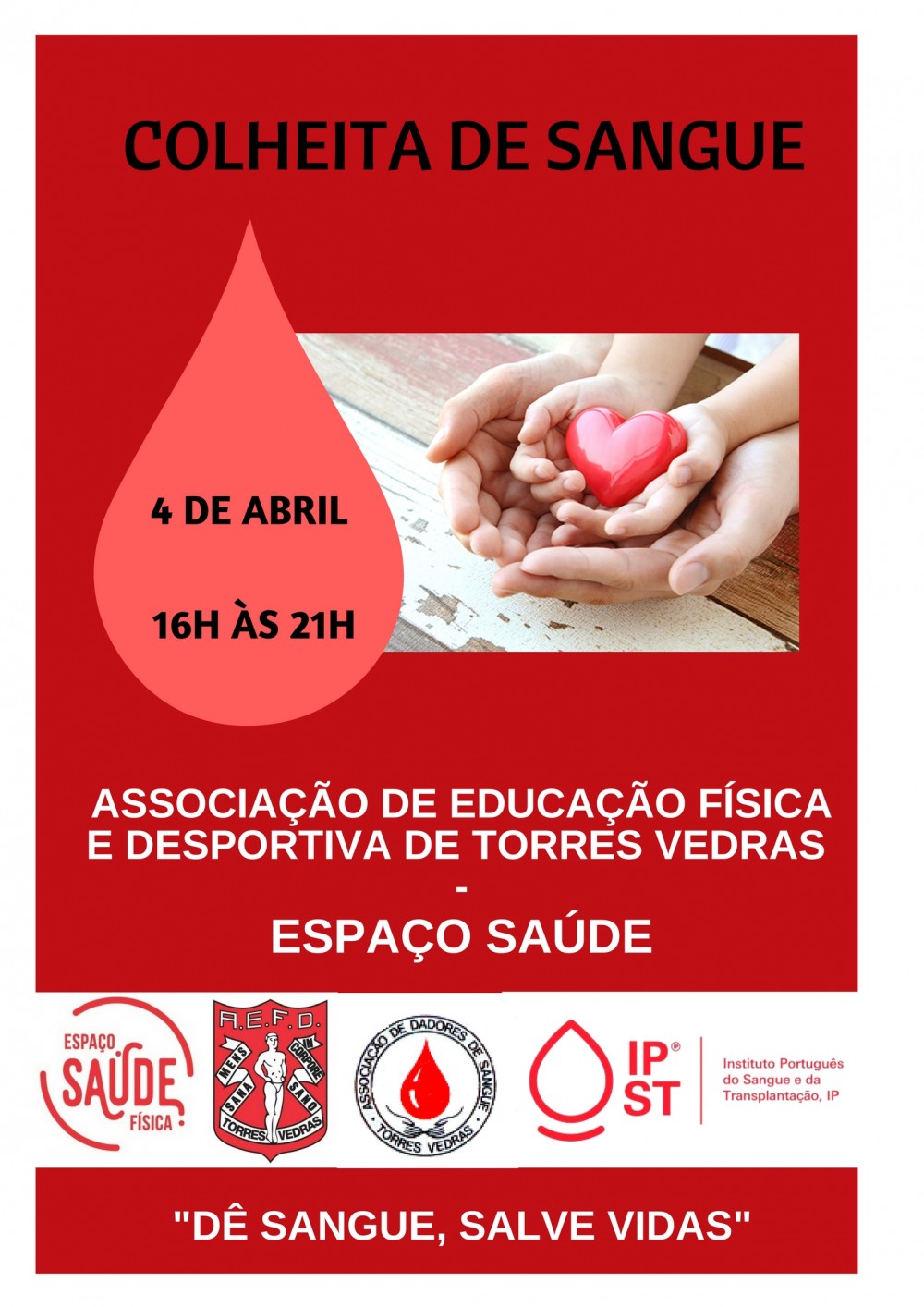 A Física junta-se à Associação de Dadores de Sangue de Torres Vedras e ao IPST, para realizar mais uma colheita de sangue no próximo dia 4 de abril, das 16h às 21h, no Espaço Saúde - Serviço de Fisioterapia.