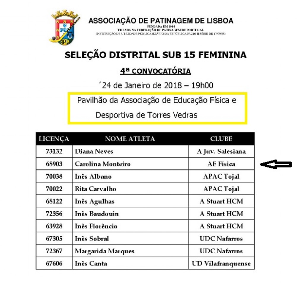 A 4ª Convocatória da Seleção Distrital Sub-15 Feminina de hóquei patins realiza-se esta quarta-feira, dia 24 de Janeiro, no Pavilhão da Associação de Educação Física e Desportiva de Torres Vedras.