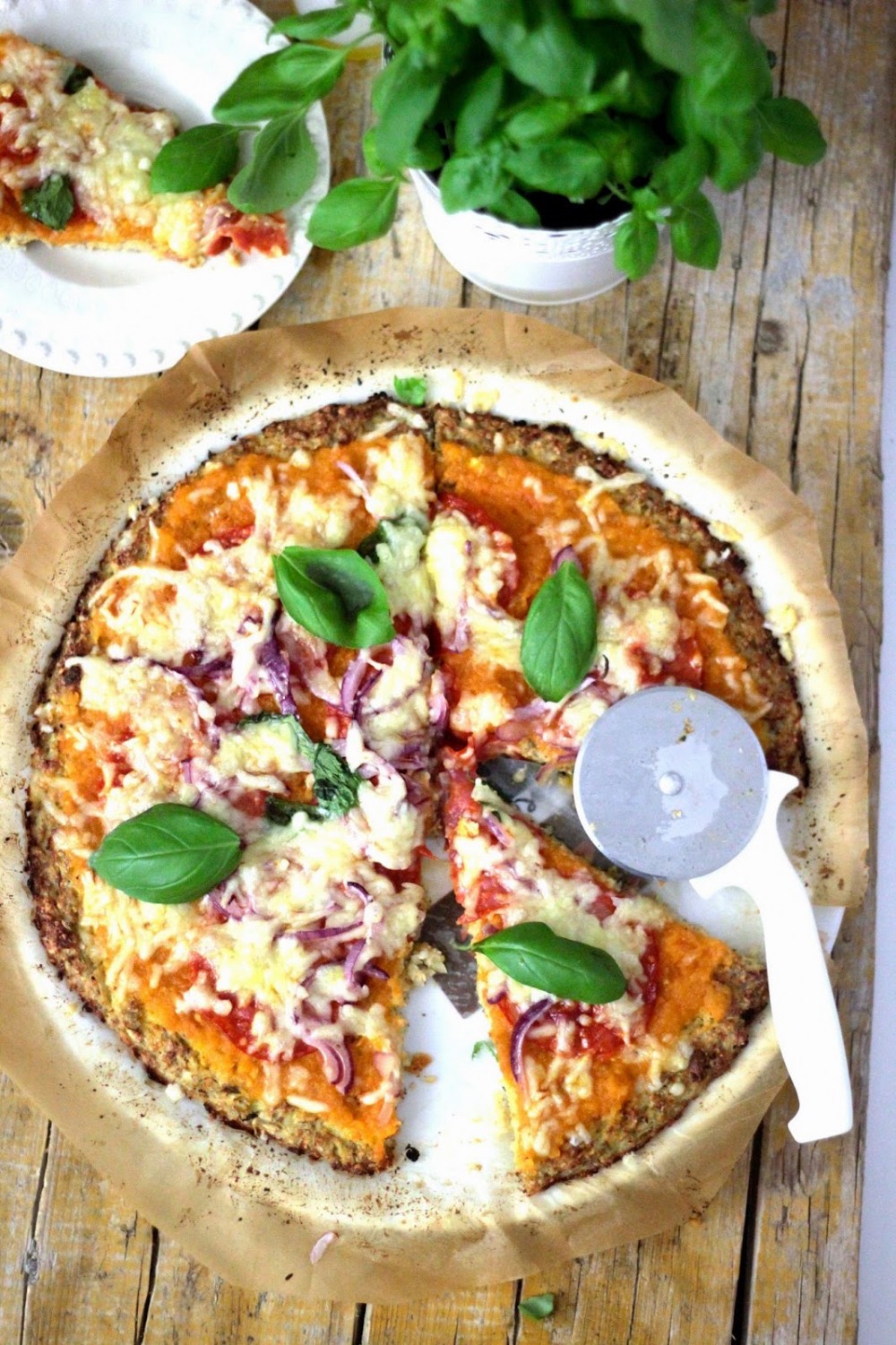 Forrar um tabuleiro com papel vegetal e colocar a massa, espalmar e dar a forma de uma base de pizza. Levar ao forno previamente aquecido a 180C durante cerca de 15 minutos.