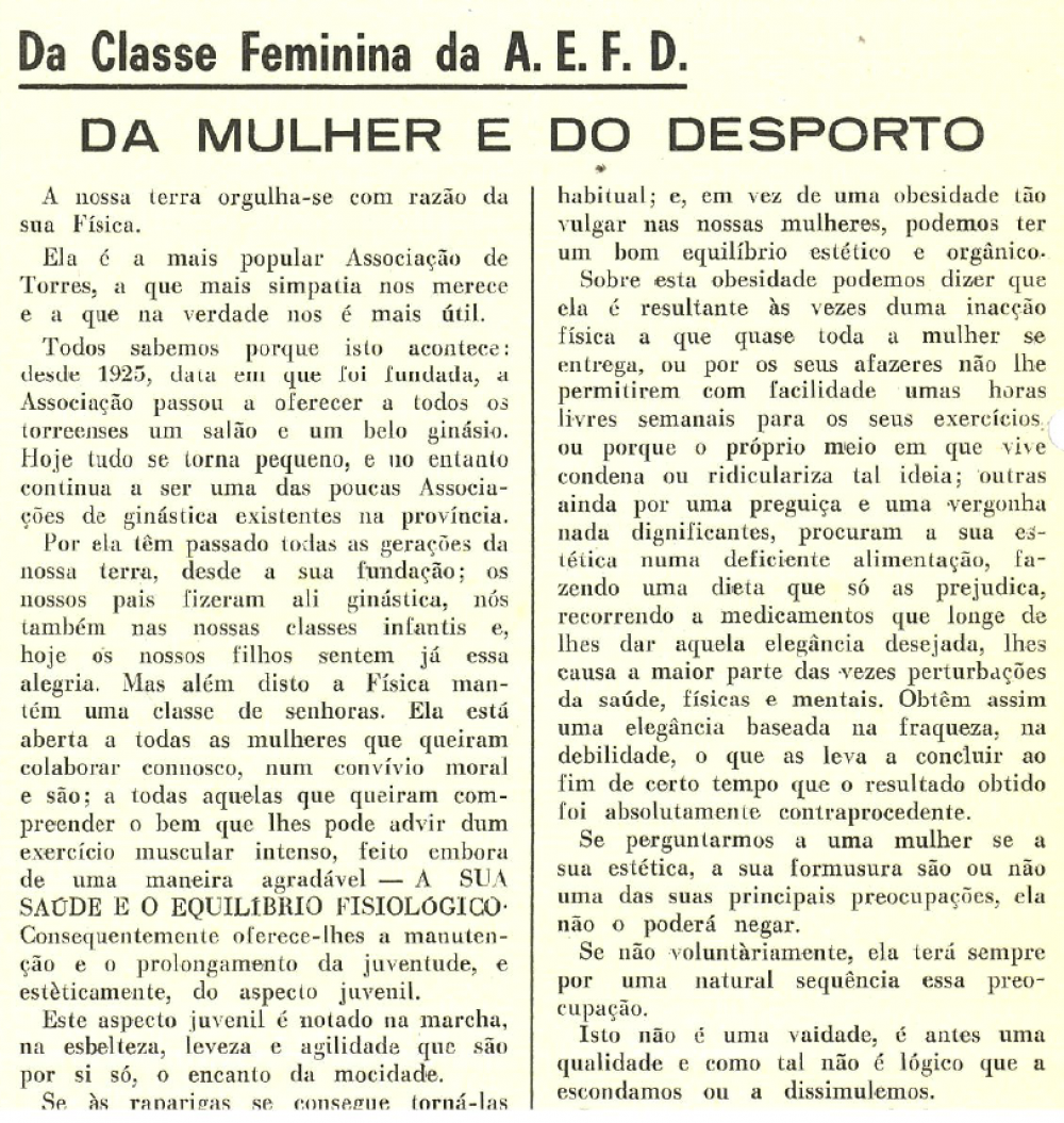 Sabia que já na década de 1960 a Física defendia a participação feminina no panorama desportivo? Os boletins publicados pela associação revelam essa preocupação, incentivando a presença das raparigas nas actividades gimnodesportivas e apelando à inscrição de senhoras nas classes de ginástica, receando o desaparecimento das mesmas (Silva e Rodrigues, 2012). Este posicionamento reflecte a própria génese da colectividade. Nascida de uma forte preocupação humanista, a de proporcionar à comunidade um espaço para a prática da ginástica e do exercício físico, a associação revelou desde cedo uma sensibilidade social que ainda hoje caracteriza a sua identidade.